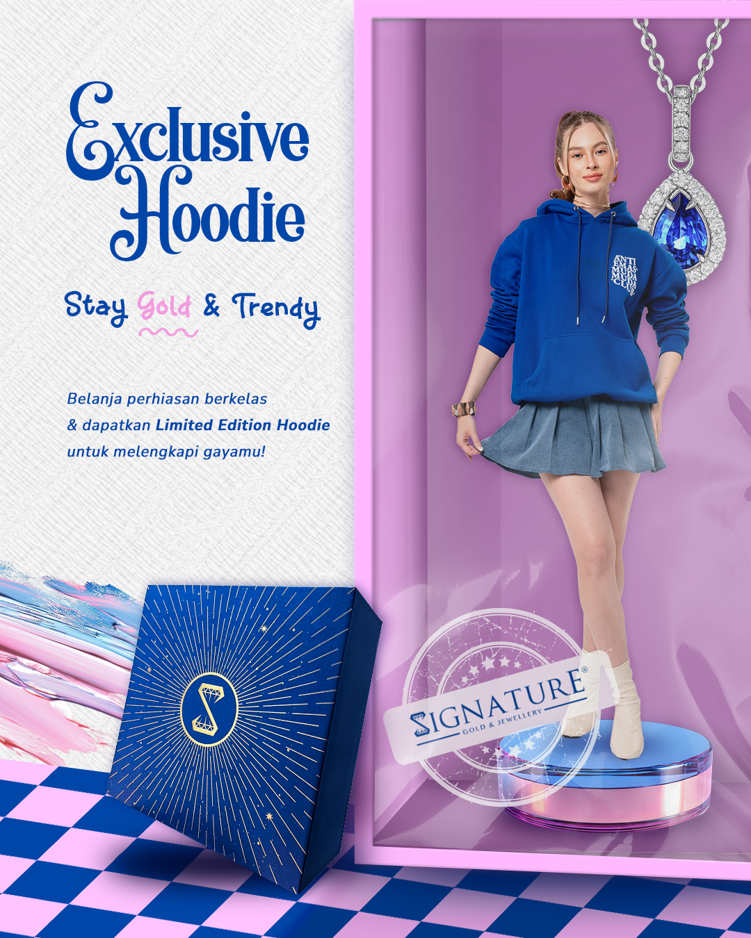 Selama periode promo, setiap pembelian perhiasan terbaru dari Signature Gold & Jewellery akan memberikan kesempatan bagi pelanggan untuk membawa pulang Exclusive Hoodie Limited Edition. Hoodie ini menjadi simbol gaya hidup trendy dan kekinian, sekaligus pengingat bahwa emas bukan hanya sekadar perhiasan, melainkan bagian dari identitas modern.