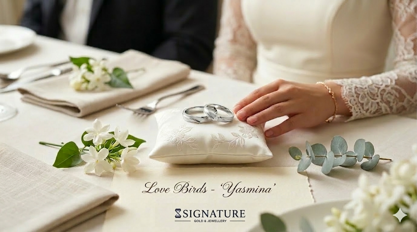 Love Birds – “Yasmina” nama ini menggambarkan dua insan yang dipersatukan oleh cinta yang tulus, saling melengkapi, dan siap menjalani perjalanan hidup bersama. Seperti bunga melati yang sederhana namun indah, cincin ini menjadi simbol hubungan yang penuh makna dan kehangatan.